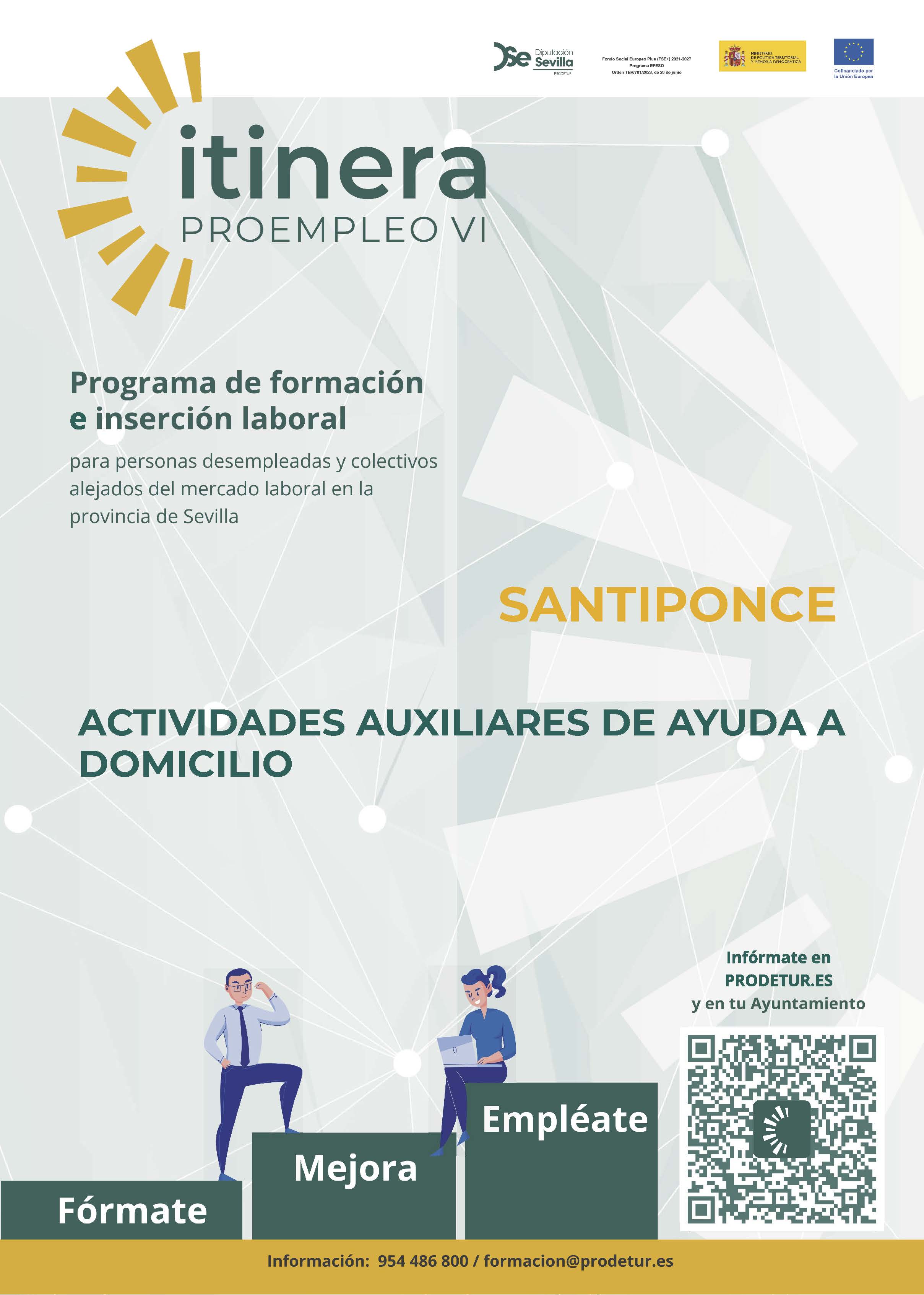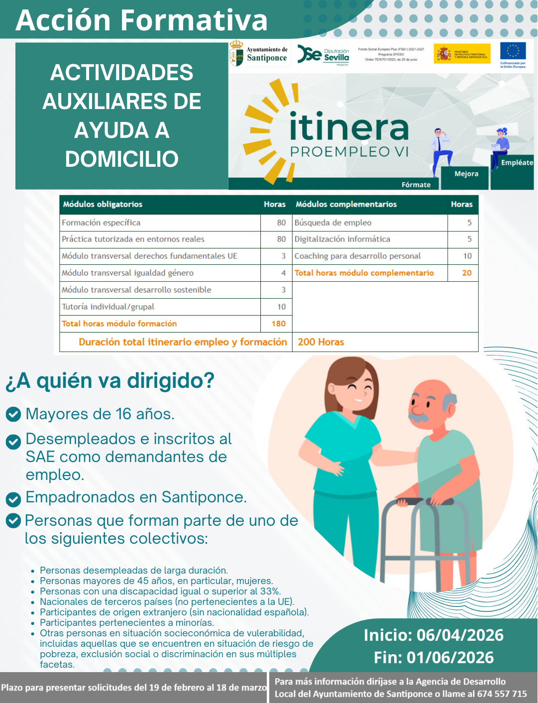Se abre plazo para presentación de solicitudes para el Curso "Actividades auxiliares de ayuda a domicilio", incluído en el Proyecto "ITINERA-PROEMPLEO VI" enmarcado en el programa de empleo, educación, formación y economía social del Fondo Social Europeo Plus (FSE+), periodo 2021-2027.