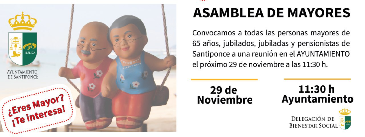 La Delegación de Bienestar Social convoca a todos los jubilados, jubiladas y pensionistas de Santiponce a una reunión que se celebrará el proximo viernes 29 a las 11:30h. en el Ayuntamiento de Santiponce.