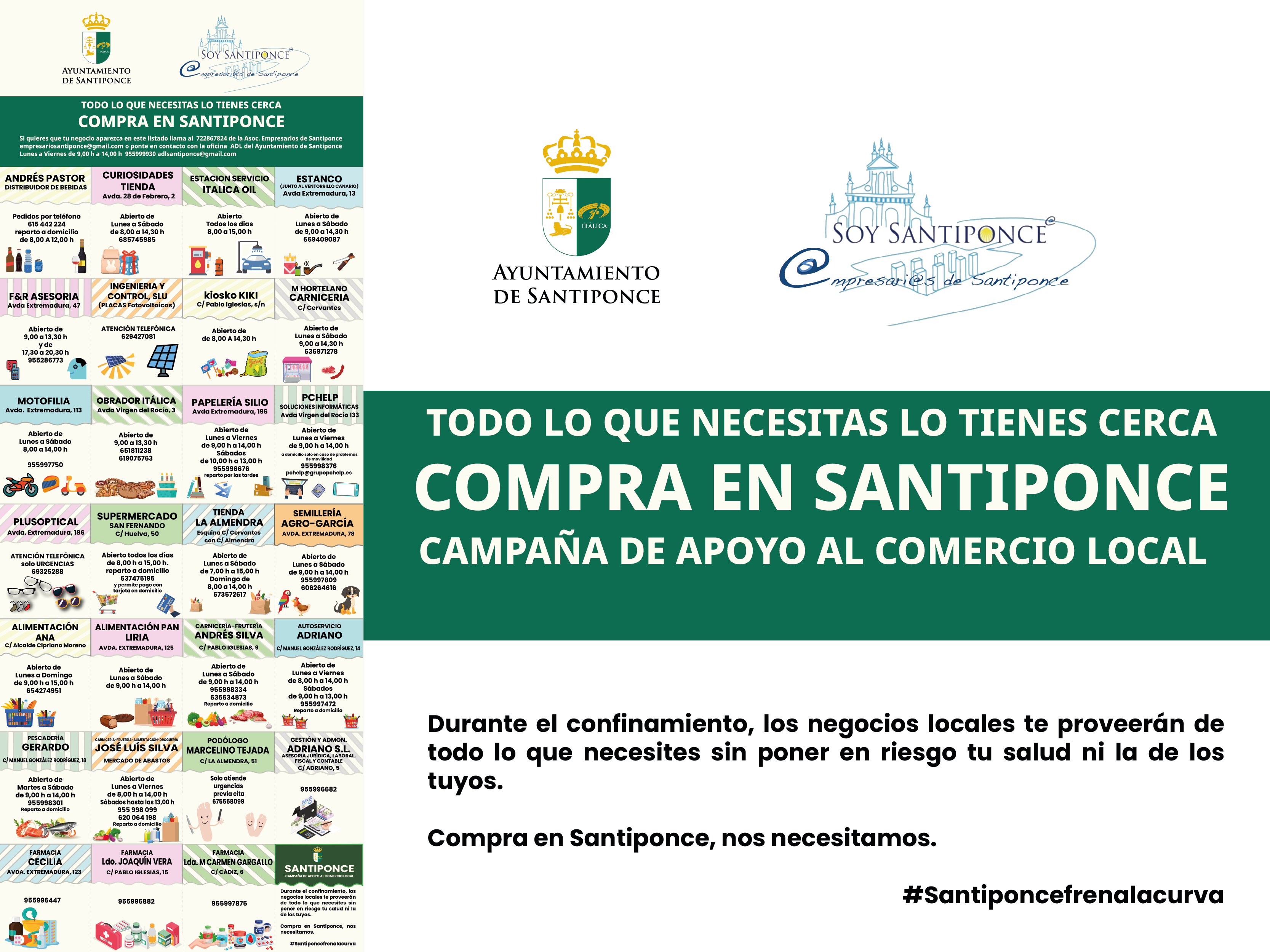 (Nota: Si quieres que tu negocio aparezca en este listado llama al 722867824 de la Asoc. Empresarios de Santiponce empresariosantiponce@gmail.com o ponte en contacto con la oficina ADL del Ayuntamiento de Santiponce Lunes a Viernes de 9,00 h a 14,00 h 955999930 adlsantiponce@gmail.com)