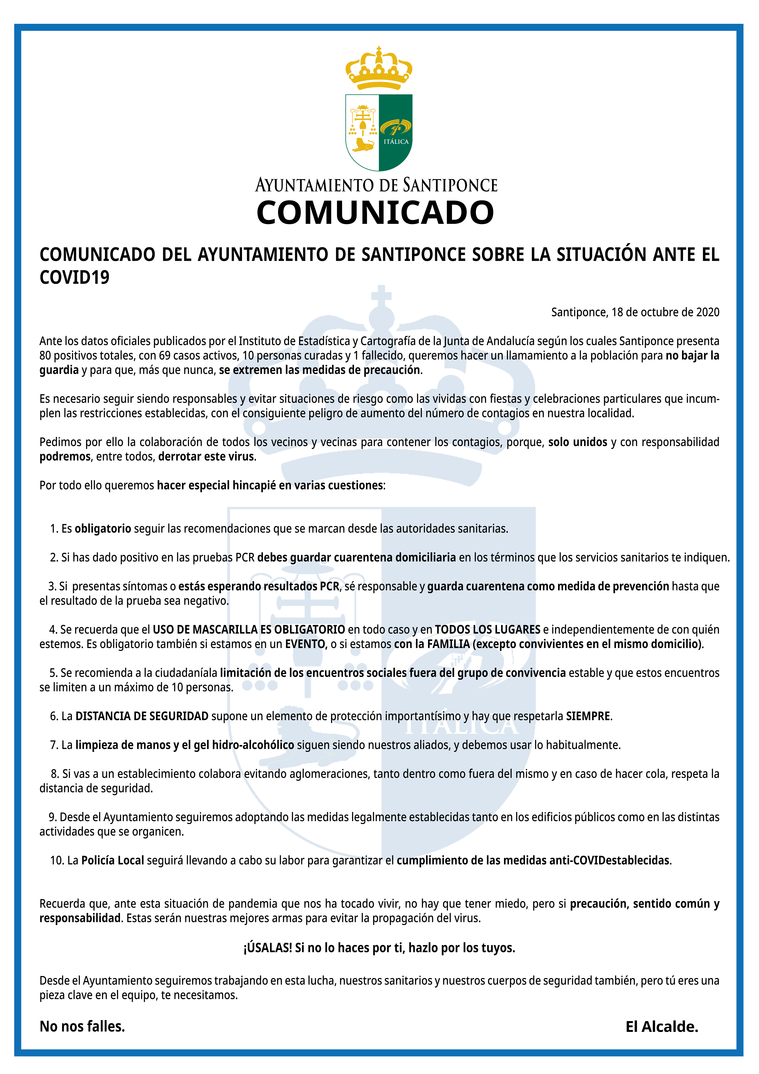 Ante los datos oficiales publicados por el Instituto de Estadística y Cartografía de la Junta de Andalucía según los cuales Santiponce presenta 80 positivos totales, con 69 casos activos, 10 personas curadas y 1 fallecido, queremos hacer un llamamiento a la población para no bajar la guardia y para que, más que nunca,se extremen las medidas de precaución.