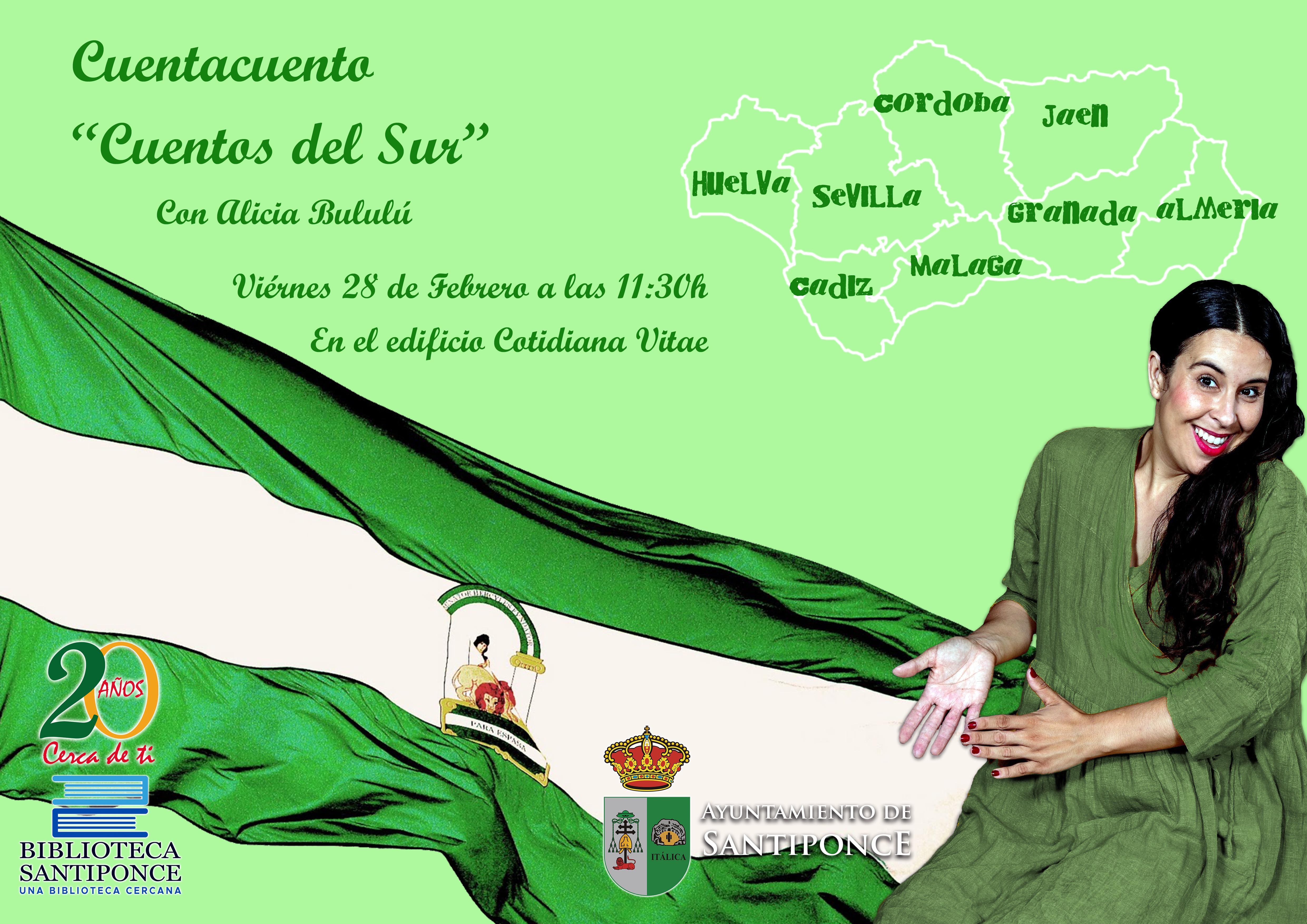 El próximo viernes 28 de febrero, Día de Andalucía, la biblioteca contará con un cuentacuentos de la mano de Alicia Bululú que nos traerá "Cuentos del Sur".