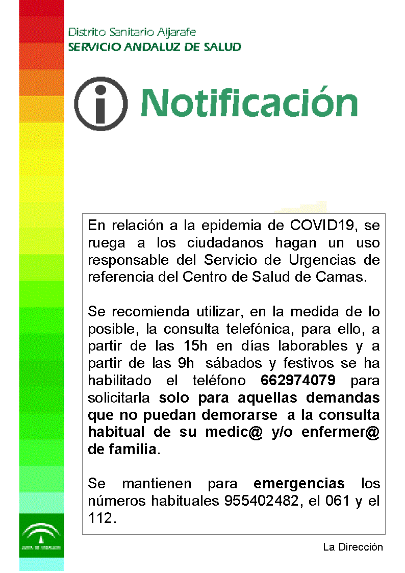 En relación a la epidemia de COVID19, se ruega a los ciudadanos hagan un uso responsable del Servicio de Urgencias de referencia del Centro de Salud de Camas.