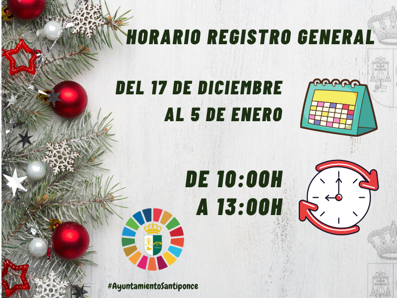 El registro general del Ayuntamiento de Santiponce atenderá al público entre las 10:00 y las 13:00 horas de los días laborables desde el 17 de diciembre hasta el 5 de enero.