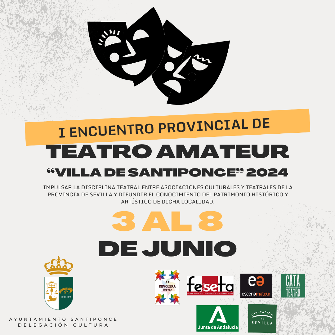 El Área de Cultura del Ayuntamiento de Santiponce junto con la Asociación Cultural “La Revolera-Teatro” de dicha localidad, avalados por FESETA (Federación Sevillana de Teatro Aficionado) y la colaboración de la Diputación de Sevilla y la Consejería de Turismo, Cultura y Deporte de la Junta de Andalucía tienen a bien, convocar una experiencia innovadora que bajo el título de “I Encuentro de Teatro Amateur, Villa de Santiponce-2024” trata de impulsar la disciplina teatral entre asociaciones culturales y teatrales de la provincia de Sevilla y difundir el conocimiento del patrimonio histórico y artístico de dicha localidad.
