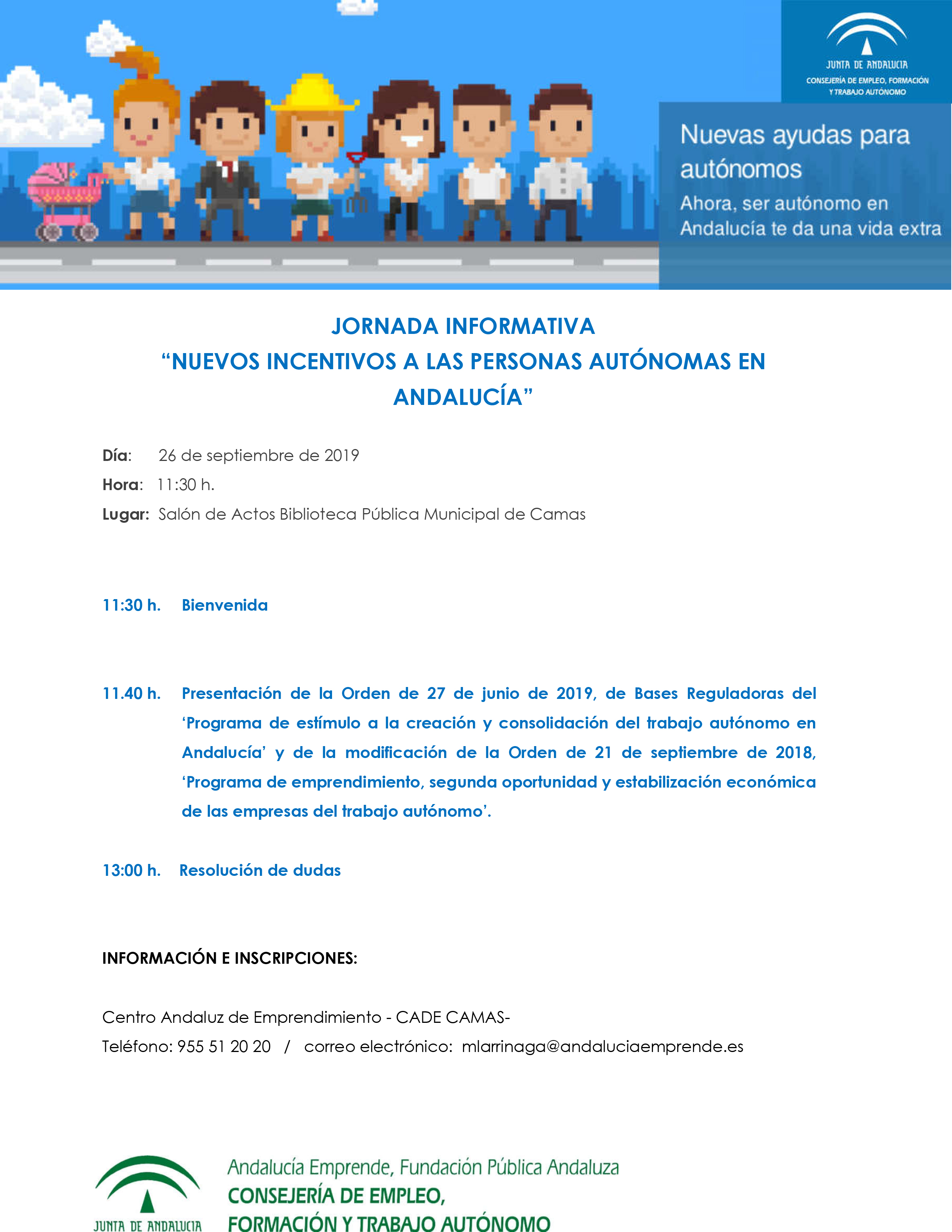 - 11.40 h. Presentación de la Orden de 27 de junio de 2019, de Bases Reguladoras del ‘Programa de estímulo a la creación y consolidación del trabajo autónomo en Andalucía’ y de la modificación de la Orden de 21 de septiembre de 2018, ‘Programa de emprendimiento, segunda oportunidad y estabilización económica de las empresas del trabajo autónomo’.
