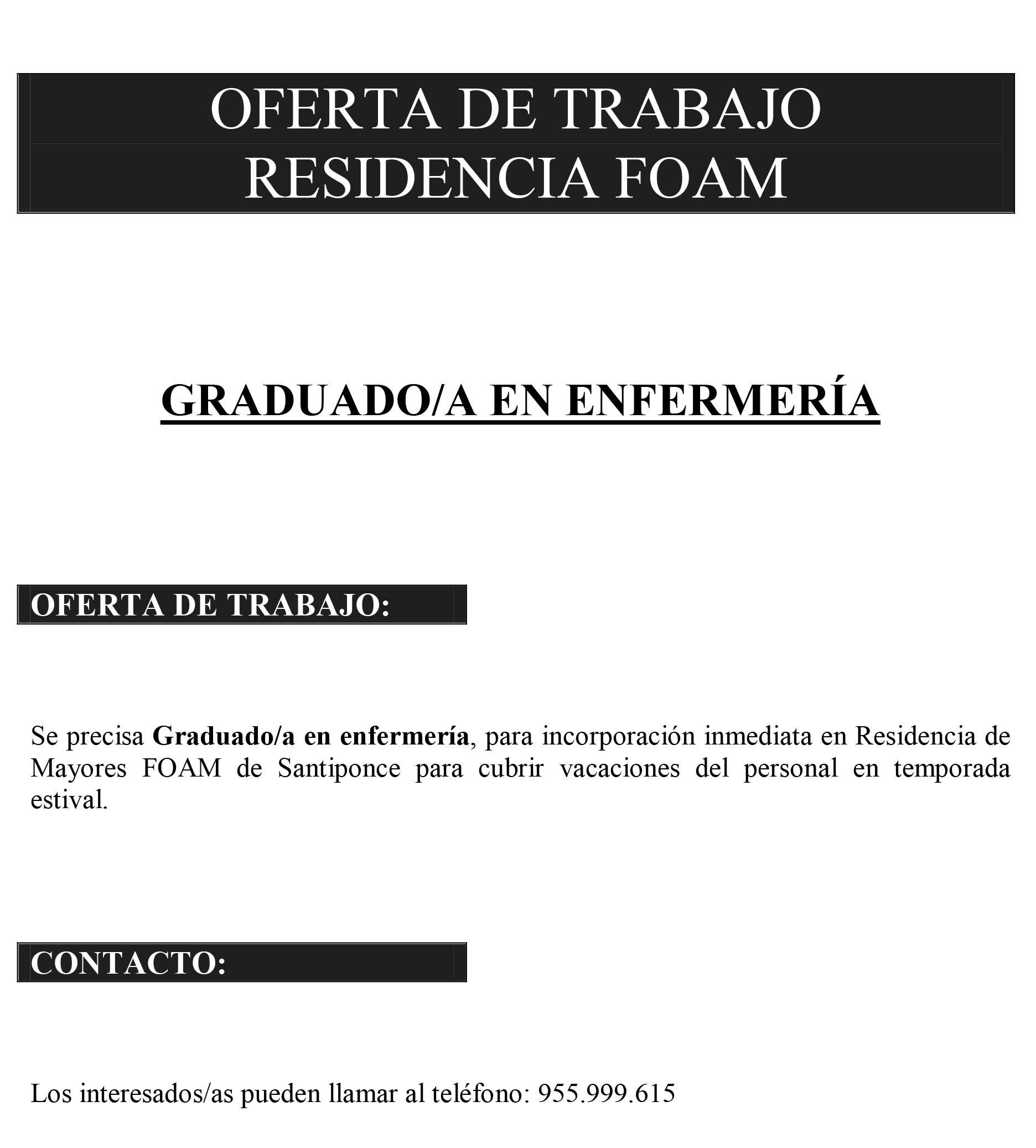 Se precisa Graduado/a en enfermería, para incorporación inmediata en Residencia de Mayores FOAM de Santiponce para cubrir vacaciones del personal en temporada estival.