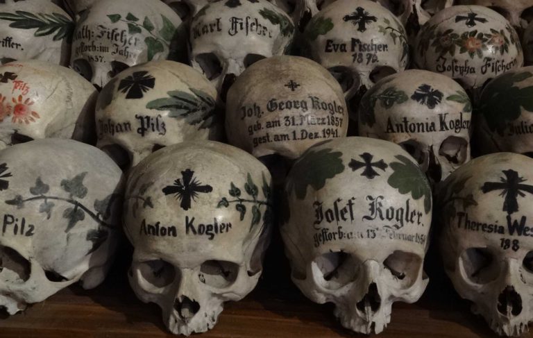 El pueblo cuenta también con una iglesia católica, Pfarrkirche, de estilo románico-gótico. Además, dentro de esta, hay un osario conocido como Hallstatter Beinhaus, con más de 1200 cráneos, muchos de ellos decorados con nombres y símbolos.