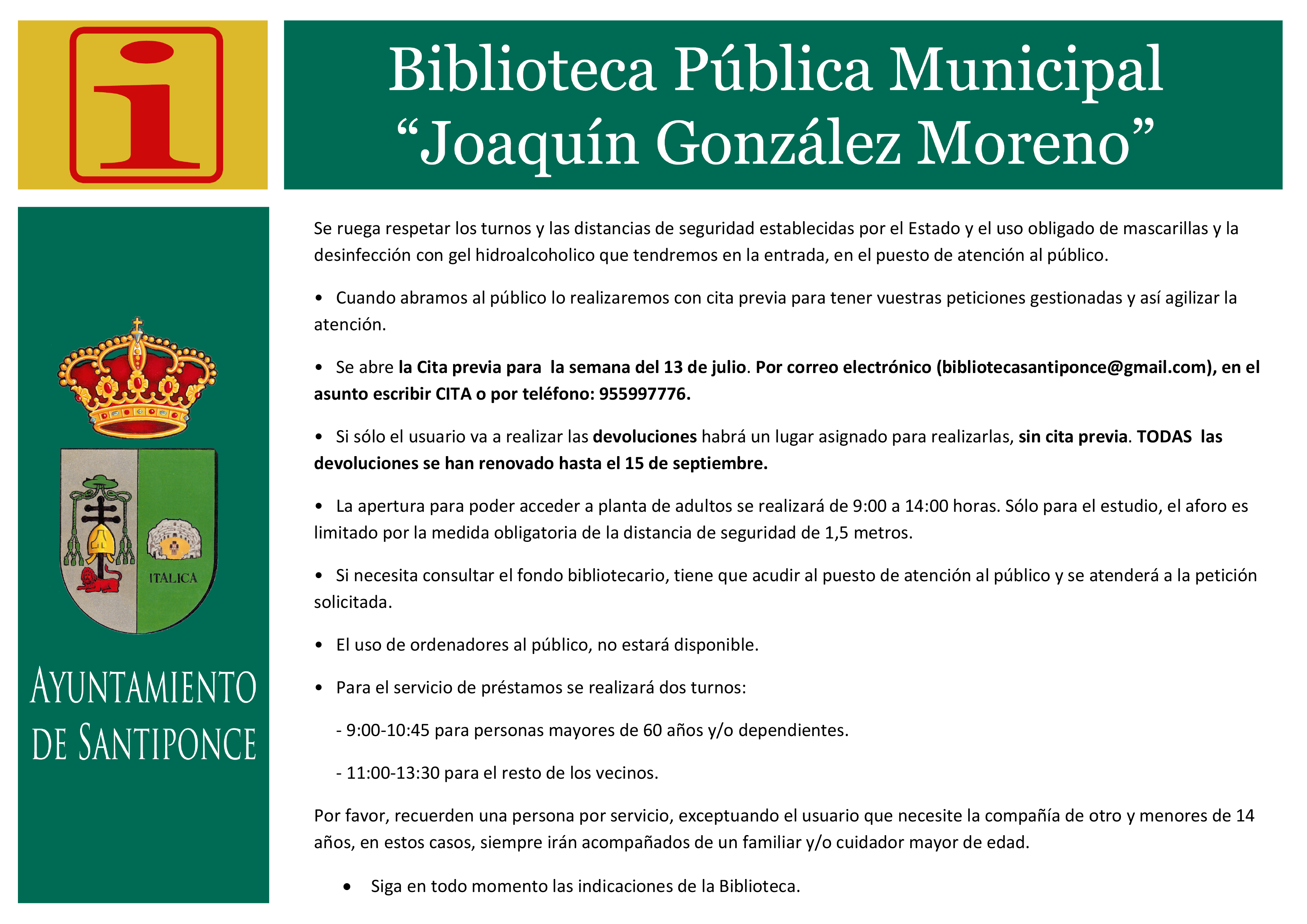 - Se abre la Cita previa para la semana del 13 de julio. Por correo electrónico (bibliotecasantiponce@gmail.com), en el asunto escribir CITA o por teléfono: 955997776, preguntar por Biblioteca.