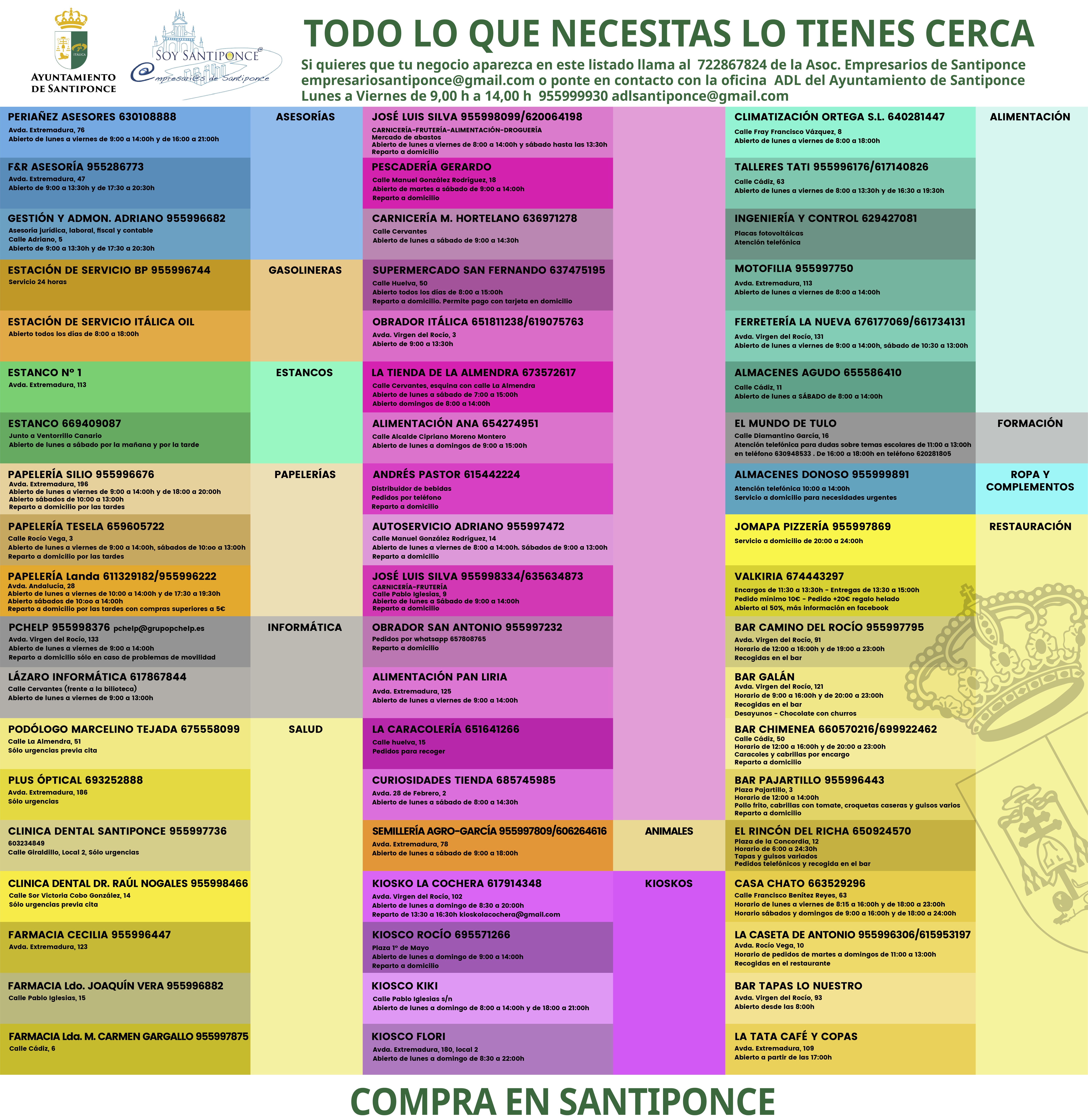 25/05/2020 #Abogados #Abonos y Fitosanitarios #Almacen de Construcción #Bancos y Cajas #Carniceria y Embutidos #Centro de Mediación #Chucherias #Correduria Seguros #Droguería, Perfumería #Estanco #Farmacia #Ferreteria #Frutas y Verduras. Comercio al por menor #Informatica #Mercería #Oficina Correos #Panaderia #Papeleria, copisteria y fotos #Parafarmacia #Pasteleria y Bomboneria #Piensos y Material ganadero #Podologa #Productos Ibericos, Vinos y Gourmet #Productos Ibericos #Servicios de Internet #Supermercados #Taller Mecánico #Tienda Comestibles #Tienda Informatica #Tienda Ropa y Merceria #Venta de golosinas y bebidas