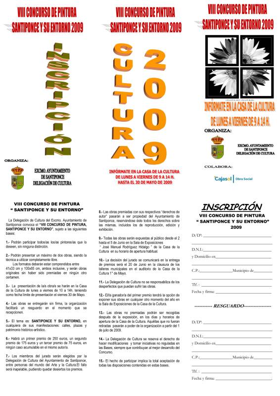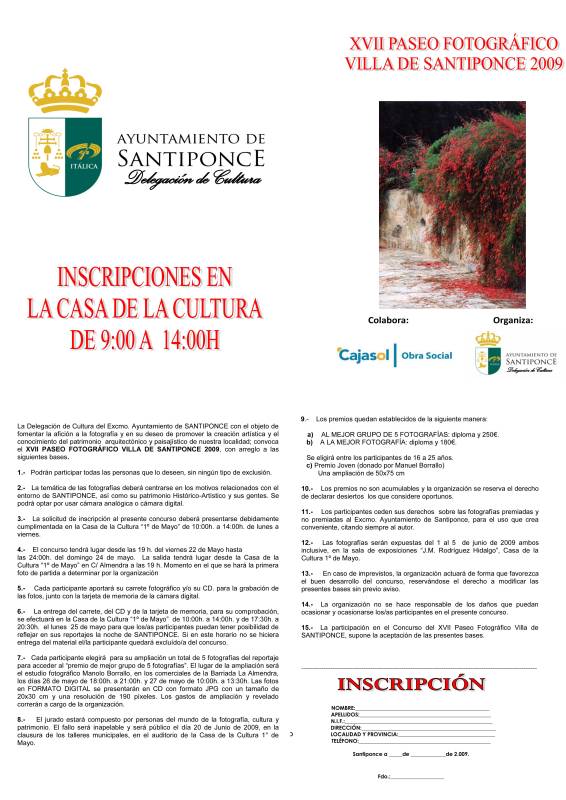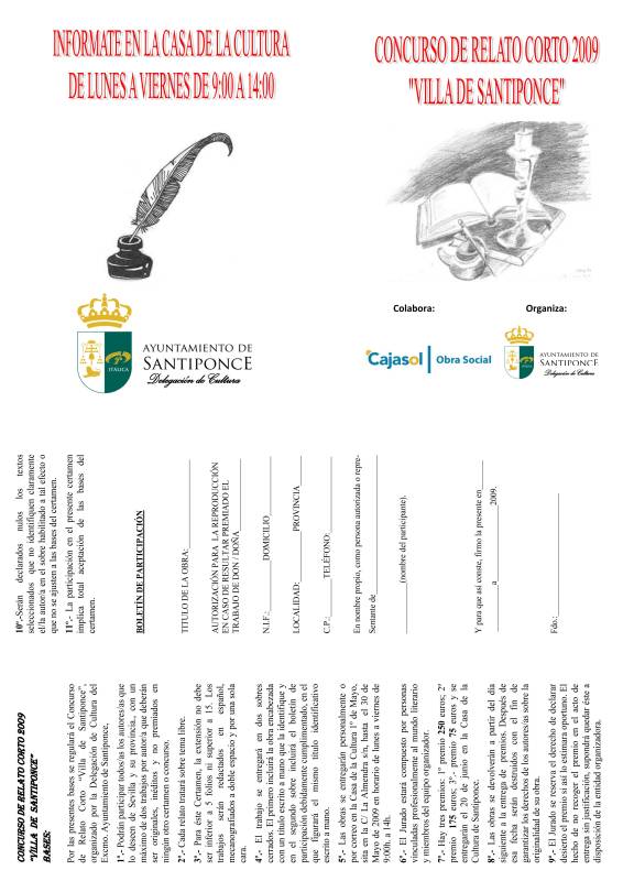 La Delegación de Cultura convoca a todos los interesados en participar en los Concursos Culturales 2009, consistentes en el "Concurso de Relatos Cortos 2009", el VIII Concurso de Pintura "Santiponce y su entorno" y el XVII Paseo Fotográfico "Villa de Santiponce".