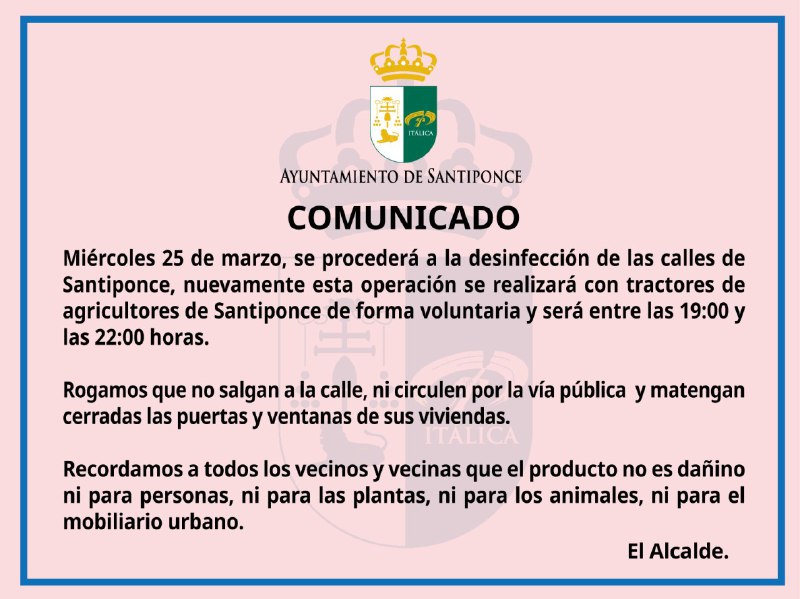 El Miércoles 25 de marzo, se procederá a la desinfección de las calles de Santiponce, nuevamente esta operación se realizará con tractores de agricultores de Santiponce de forma voluntaria y será entre las 19:00h y las 22:00h.