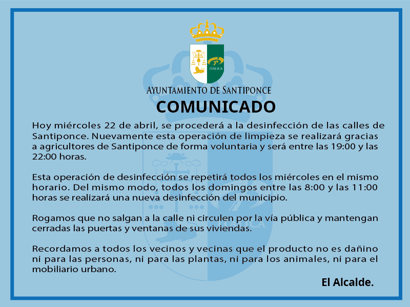 Recordemos que hoy miércoles 22 de abril, se procederá a la desinfección de las calles de Santiponce. Nuevamente esta operación de limpieza se realizará gracias a agricultores de Santiponce de forma voluntaria y será entre las 19:00 y las 22:00 horas