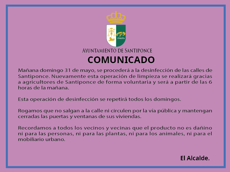 Recordemos que mañana domingo 31 de mayo, se procederá a la desinfección de las calles de Santiponce. Nuevamente esta operación de limpieza se realizará gracias a agricultores de Santiponce de forma voluntaria y será a partir de las 6:00 horas de la mañana.