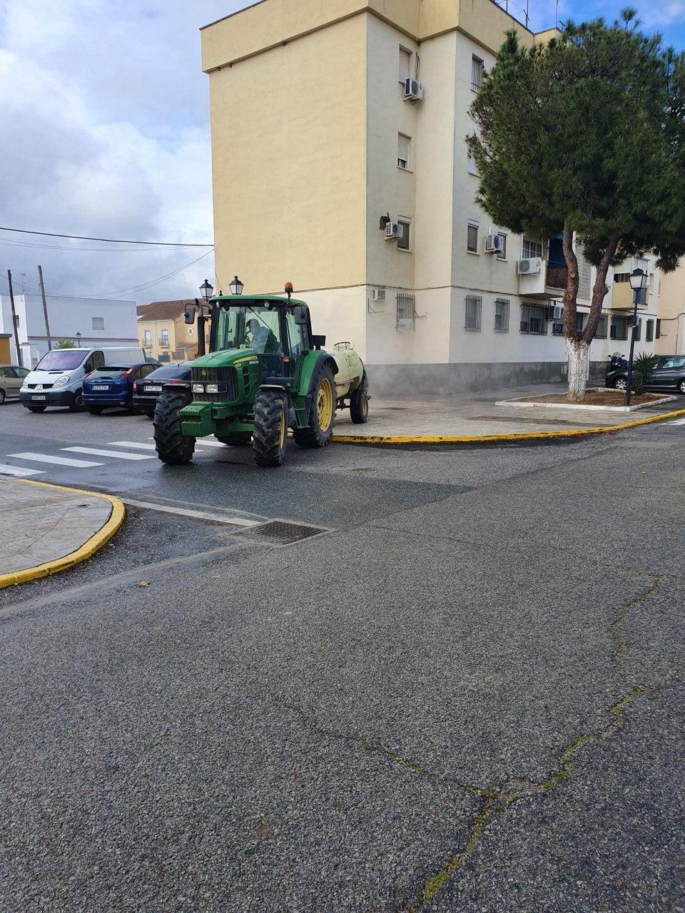 Durante la mañana del domingo, cuatro tractores de agricultores de Santiponce, han desinfectado las calles de nuestro pueblo vertiendo más de 15.000 litros de desinfectante, los tractores han llegado casi al cien por cien de las calles de Santiponce.